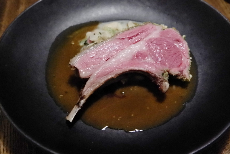 「十勝産仔背肉のロースト香草風味、グリーンペッパーソー」